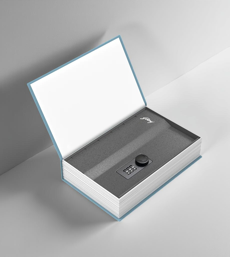 A compact, book shaped personal locker by Godrej that holds up to 1.4 liters, secured with a simple 3 digit combination lock. Designed to blend into bookshelves, it discreetly stores small valuables—cash, keys, jewellery.